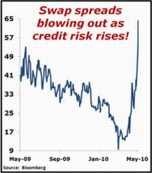 http://www.bloomberg.com/apps/news?pid=20601087&sid=aZWveN7GJtks&pos=7 The swap spread chart is basically a red flag that goes up when banks are preparing for serious market turmoil. It seems as though that turmoil may be near due to the explosion in swap spreads in such a short period of time. You can read more about swap spreads and their warning signs here:
